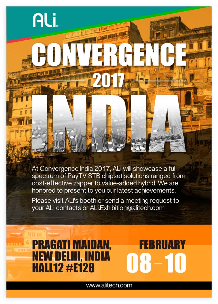 At Convergence India 2017, ALi will showcase a full spectrum of PayTV STB chipset solutions ranged from cost-effective zapper to value-added hybrid. We are honored to present to you our latest achievements. Please visit ALi's booth or send a meeting request to your ALi contacts or Email住址會使用灌水程式保護機制。你需要啟動Javascript才能觀看它.